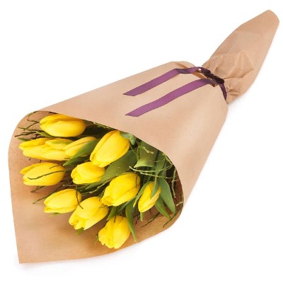 Klassisk bukett med gule tulipaner vakkert innpakket med silkebånd. Med sine solrike farger er denne buketten en ekte gledesspreder. Perfekt til bursdager, viktige jubileer og alt annet du vil feire. Buketten er et eksklusivt blomsterhåndverk, og tulipanene er nøye utvalgt for å sikre høy kvalitet. Buketten leveres av en lokal blomsterhandler.