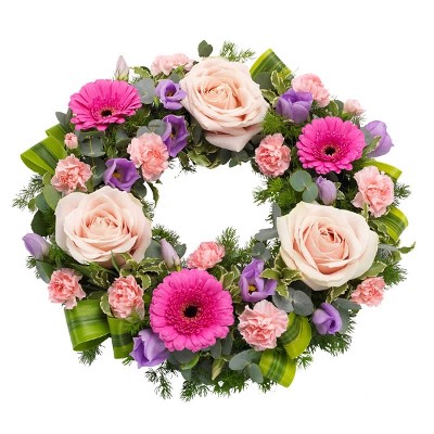 Dekoratørens vakker nydelige krans i rosa og lilla. Samt årstidens grønt, og er ca 50 cm i diameter. (bildet er kun et eksempel på hvilke blomster og farger som buketten kan innehold) begravelse.