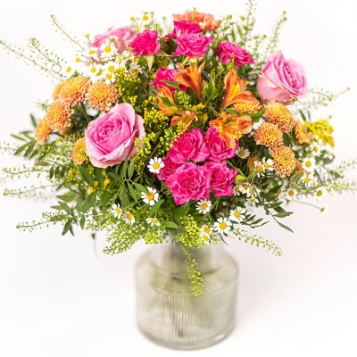 Vakre bukett med blomster som nelliker, solidago og store pittosporum sammen med sesongens grønne. Med sine oransje og rosa nyanser er denne buketten en ekte gledebringende. Buketten er et eksklusivt blomsterhåndverk, og blomstene er nøye utvalgt for å holde høy kvalitet. Hver bukett er unik og bindes ut fra sortiment og sesong – men beholder alltid sin farge og form. Buketten leveres av en lokal blomsterhandler.